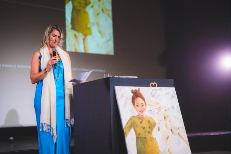 Kwamen ook hun verhaal doen op het podium: ouders Melanie en Pieter, die in het Ronald McDonald Huis verbleven tijdens de ziekte van hun dochter Lou. Ook broer Flo logeerde mee in het Huis. Zij blikken dankbaar terug op hun tijd in deze veilige haven. “Het Huis, dat is ongelooflijk thuiskomen”, vertelde Pieter. “Je wordt er omarmd, ondersteund, je krijgt daar alle begrip en tijd om te landen.” Melanie vatte het mooi samen: “Het Huis, dat betekende voor ons echt alles. Dankjewel.”
